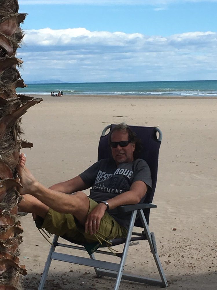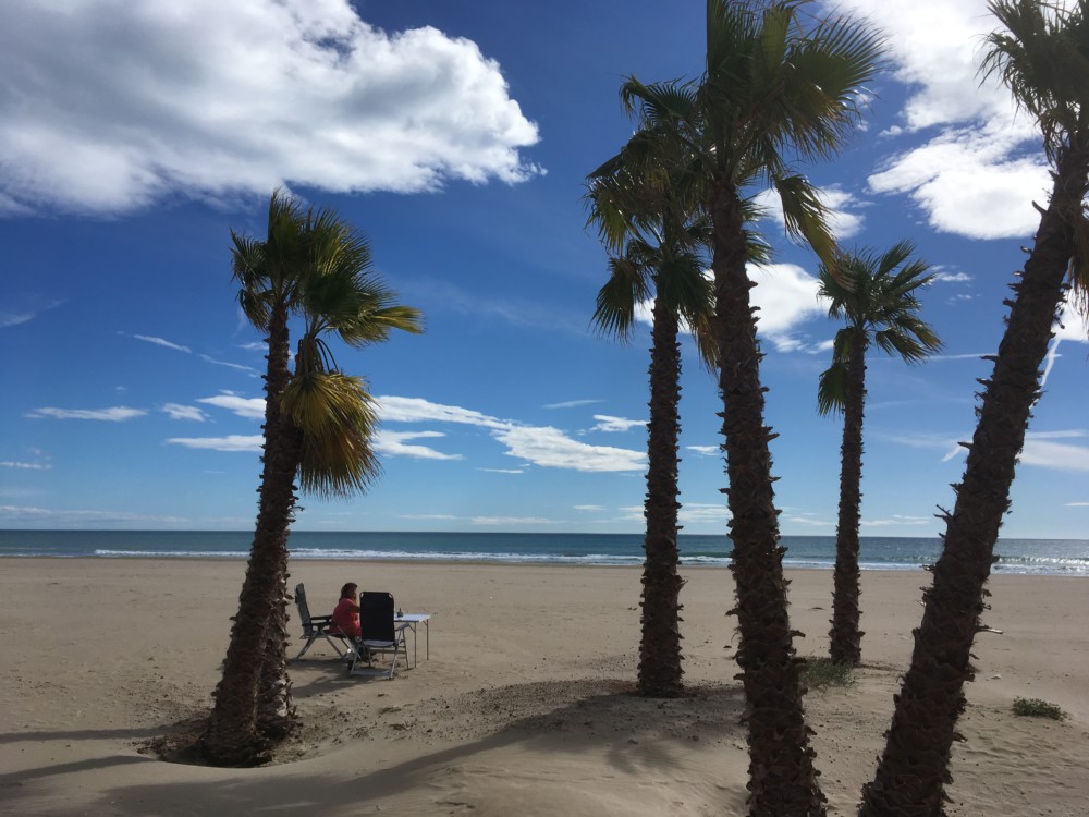 Am nächsten Morgen war traumhaftes Wetter. Bis auf ein paar Schönwetterwolken nur purer Sonnenschein und wir machten gleich nach dem Frühstück einen langen Spaziergang über die Promenade. Ich ging später den selben Weg zurück, während Bernd den Strand vorzog. Gleichzeitig kamen wir am Wohnmobil an. Ich total abgekämpft, Bernd absolut tiefenentspannt. Nun waren wir der Meinung genug Bewegung gehabt zu haben. Gestern hatte ich schon entdeckt, dass der Strand wirklich wunderschön ist, wenn man auf´s Wasser und bloß nicht nach hinten zu den Betonklötzen sieht, die wie gesichtslose Riesen hinter der Promenade emporragen. Da man auf dem Stellplatz kein Campingverhalten an den Tag legen durfte, nahmen wir unseren Tisch und unsere Stühle einfach kurzerhand mit zum Strand und verbrachten dort einen wunderbaren Tag unter Palmen.
