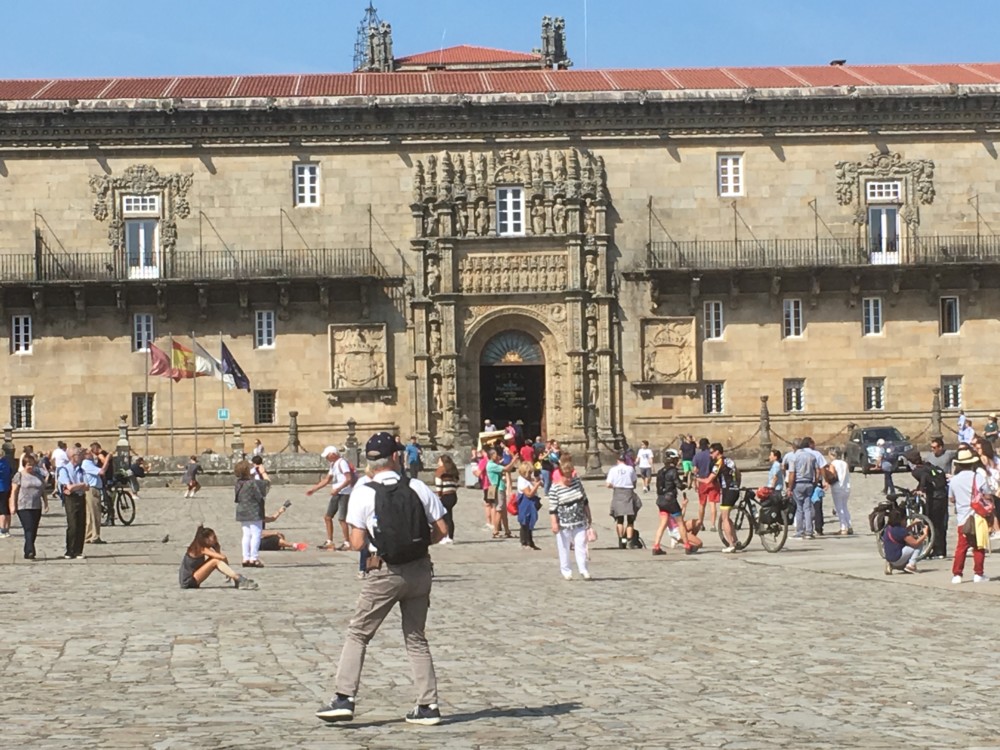 Die gesamte Plaza besteht aus uralten Gebäuden und irgendwie habe ich mir so immer den Vatikanstaat vorgestellt. Echt toll. Die Stimmung katapultiert uns erst recht ins Mittelalter, als plötzlich Dudelsackmusik ertönte. Mir lief echt eine Gänsehaut über den Rücken. Überall auf der Plaza sitzen Leute auf der Erde und es gibt unzählige Pilgerer, die just in diesem Moment erschöpft aber glücklich eintreffen.