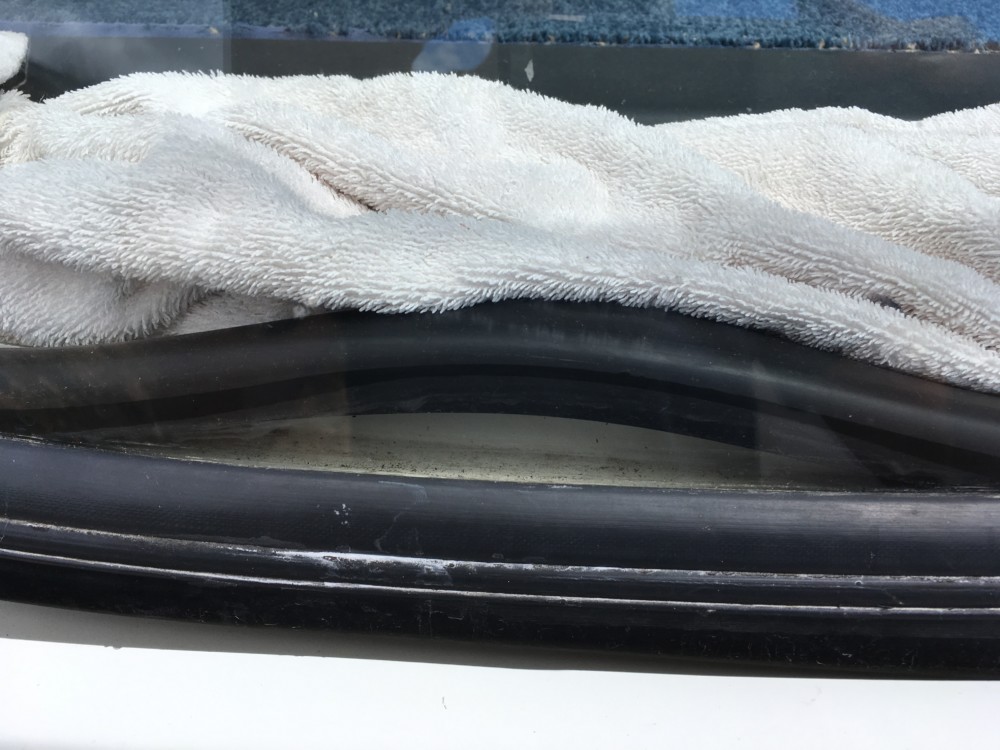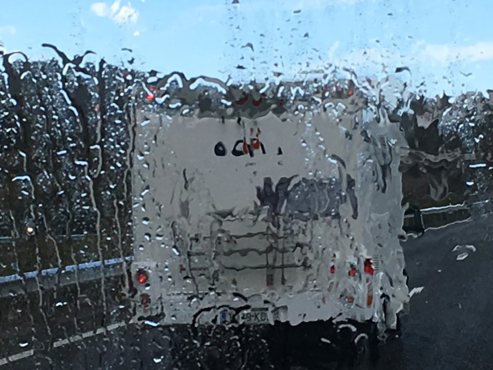 Danach geht es dann in Riesenschritten nach Melle in Deutschland, wo mittlerweile zum dritten Mal unsere Frontscheibe ausgetauscht werden soll. Diese sieht von Tag zu Tag furchtbarer aus und sorgt hier für allgemeinen Gesprächsstoff. Bernd hat sie jetzt zusätzlich noch von außen mit Zurrgurten befestigt. Das sieht mehr als abenteuerlich aus.