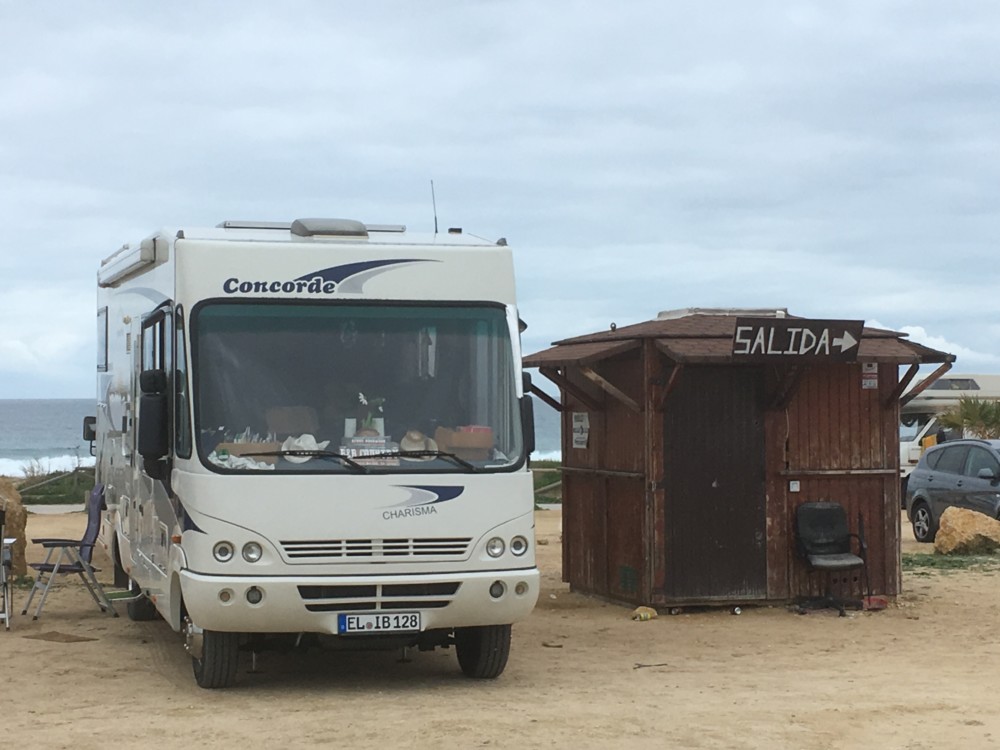 Heute war das Wetter nach 4 Tagen wieder echt schön. Wir hatten strahlenden Sonnenschein bei 18 Grad. Gegen Mittag sind Nico und Claudia abgefahren und nach der langen Zeit, die wir zusammen verbracht haben fühlen wir uns nun etwas einsam. Besonders Nico mit seiner ansteckenden, unkomplizierten und witzigen Art wird uns sehr fehlen. Bailey hatte den Abschied schon gespürt und war kaum von Bernds Seite weg zu bekommen. Zur Ablenkung haben wir dann erst einmal draußen gescrabblet und Bernd hat mit einem einzigen Punkt Vorsprung gewonnen. Danach haben wir uns dann noch gegenseitig spanisch abgefragt und waren beide mit unseren Leistungen sehr zufrieden. Gegen Abend füllte sich unser Platz. Die meisten kommen aus Richtung Mittelmeer und alle sind einstimmig der Meinung, dass es hier am Atlantik viel schöner ist. Eigentlich hatten auch wir vor am Mittelmeer zu überwintern, weil es dort angeblich viel wärmer ist, aber beim ständigen Vergleich der Wetterberichte kann ich das nicht wirklich bestätigen und so bleiben wir erst einmal hier. Ganz ehrlich: Schöner kann man einfach nicht stehen. Direkt am Atlantik, mit einem Wahnsinnspanorama und Meeresrauschen inklusive. Dies ist am Mittelmeer kaum möglich und die Stellplätze sind laut Aussagen der Neuankömmlinge alle gnadenlos überfüllt. Warum also bitteschön sollen wir dorthin? Trotzdem werden wir irgendwann natürlich weiterfahren, aber uns hetzt ja keiner und so genießen wir es hier noch ein bißchen. Abends schmeißen wir noch einmal den Generator an, weil wir den restlichen Pizzateig von Nico backen wollen. Leider wird aber der Teig nicht richtig gar und die Sicherung des Backofens springt raus. Egal, wir essen sie trotzdem, wie immer mit guten Apetit!! Danach sehen wir noch etwas fern und schlafen dann schnell ein.