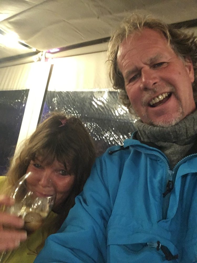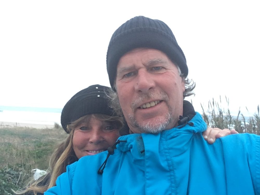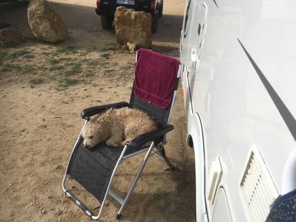 Heute nacht war es wirklich eisigkalt und eigentlich ist es jetzt mit 7 Grad Außentemperatur und 11 Grad Innentemperatur immernoch. ich habe heute Nacht absolut fantastisch geschlafen und zwar bis gerade eben. Es ist schon 8 Uhr 30 und ich sitze hier in meiner Kühlhausjacke, die mir Bernd aus der Garage gefischt hat und einer molligen Decke um die Beine und schreibe Blog. Meine Hände sind schon jetzt eiskalt und ich muss mich mit Blog schreibn beeilen , damit ich fertig bin, bevor sie gänzlich eingefroren sind. Gestern war es genauso kalt und zum Frühstück und am Abend machen wir mittlerweile die Heizung an. Gestern Abend waren wir wieder bei Nico und Claudia eingeladen. Es gab eine fantastische Ente mit Knödeln und einer irrsinns Rotweinsoße. In dieser Form mag selbst ich Rotwein und es war mal wieder unglaublich lecker. Langsam habe ich das Gefühl, wir haben Urlaub mit Halbpension gebucht und Bernd ist schon dabei sich an diesen Luxus zu gewöhnen. Kennt er es doch sonst nur mindestens 3 Tage dasselbe zu essen. Ich hoffe, er gewöhnt sich nicht allzusehr daran. Überhaupt ist es ein Glücksgriff die beiden kennengelernt zu haben, denn wir haben jede Menge Spass zusammen und die Chemie stimmt zu 100 Prozent. Auch meiner Figur kommt es zugute, da ich auch gestern wieder mit Claudia und den beiden Hunden einen langen Spaziergang gemacht habe. Unterwegs haben wir einen Sonnenschirm gefunden und mit zu uns zu den Wohnmobilen genommen. Es war sehr sehr windig und wir beiden waren der Meinung, diesen irgendwie als Windschutz nutzen zu können. Schon vor dem Spaziergang hatte ich Bernd gebeten, den Windschutz aufzubauen. Bei der Rückkehr stellte ich aber fest, dass natürlich noch nichts passiert war und so war es von Nöten etwas Dampf zu machen. Zu dritt bauten wir ihn auf und der Sonnenschirm wurde auch noch integriert. Nun hatten wir es trotz der nur 13 Grad Tagestemperatur herrlich warm, konnten sogar in kurze Hose umsteigen und verbrachten den ganzen Tag dort.